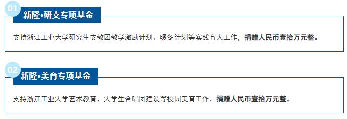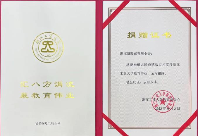 浙江新隆慈善基金会为支持浙江工业大学教育事业的发展,向浙江工业大学教育基金会捐赠人民币贰拾万元整,设立“浙江工业大学新隆大学生发展基金”,用于浙江工业大学的实践育人、校园美育等教育工作。