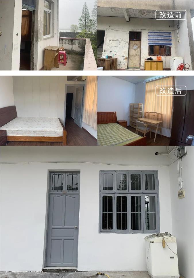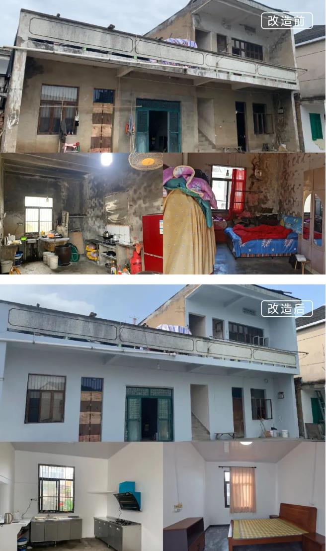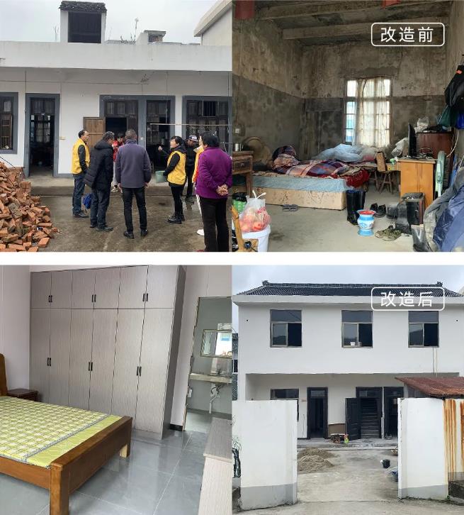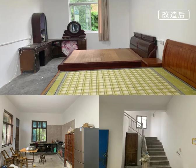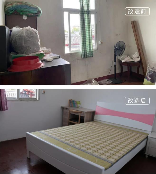 涂茨镇前山姚村残疾低保户董某和82岁的老母亲一起住在建造了几十年的自建房中,靠低保维持生活。房屋年久失修,边上两间横梁都有些断裂,而他们住的房间墙面剥落、床架断裂。项目组和老奶奶商讨后,将居住的房间重新粉刷并更换掉老旧家具,让他们的生活空间变得更加干净整洁。