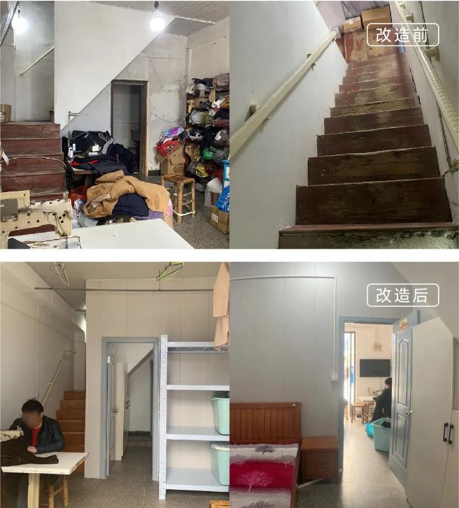困境儿童小倩,父母是残疾人,去年爷爷因病去世,父母又长期住院,由奶奶照顾长大,仅靠低保生活。家里屋面都斑驳老化,衣物杂物堆放在一起,十岁的小倩仍然和奶奶睡在一张床上,没有自己的房间。项目组与奶奶商讨后,决定将二楼的阁楼改造成小倩的房间,并在楼梯上方做个大衣柜用来储藏被子、衣服,极大地改善了小倩的生活空间,更有利于她的身心成长。