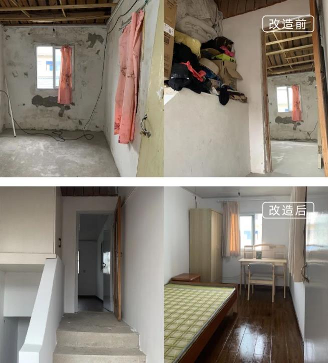 俞爸爸四级肢体残疾,独自抚养两个孩子(17岁、13岁),小儿子听力二级残疾是一名初一的学生,大女儿是一名高三学生。他们的房屋因年久失修,整幢房子只有二楼的一间稍经装修过的房间可以居住。平时读高中的姐姐住校,周末回来就睡里面小床,弟弟和父亲挤在外面的双人床。改造后,项目组将二楼房间隔开成二间,里面是独立的小房间,平时姐姐住校时候弟弟也可以睡在里面,不用和父亲再挤在一起。房屋的外墙经重新粉刷后,焕然一新。