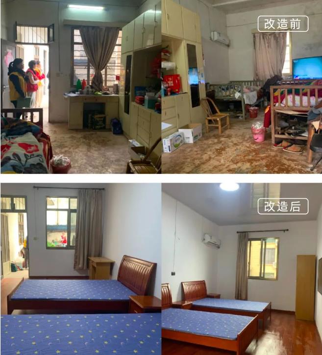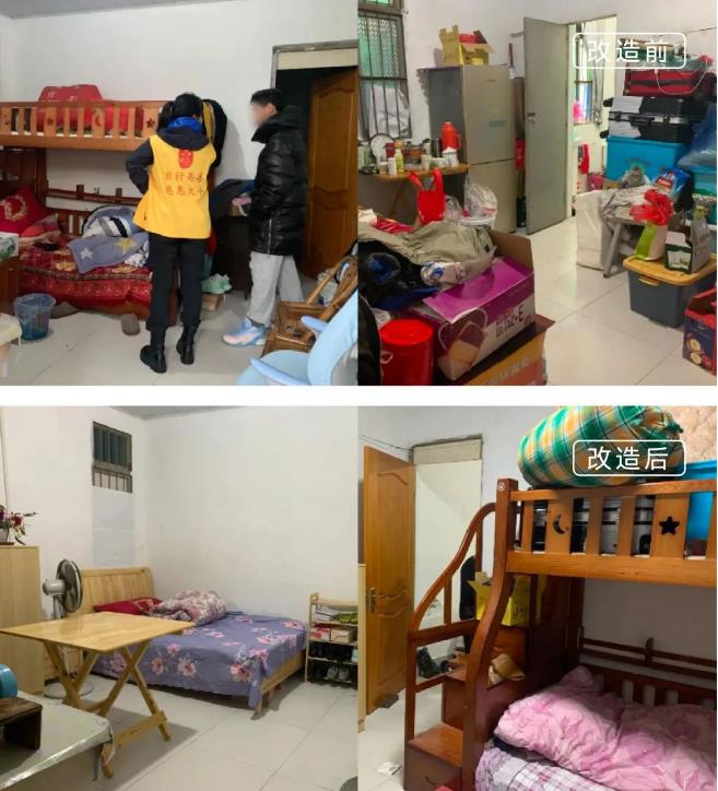 李同学是一名小学二年级的学生,父亲平时做小工,母亲智力残疾,还有一个弟弟读幼儿园,家庭贫困且家里家务严重缺失。自建房年久失修,卧室、厨房的墙面都是黑斑,房间里衣物杂物乱堆。经与户主商讨后,项目组决定将二楼居住的房间进行改造并更换家具,厨房、楼道等墙面粉刷,所有杂乱堆放的衣物整理到小房间里,让一家人有个干净、卫生的生活空间。